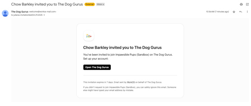 All users will receive an email from The Dog Gurus inviting them to join a business's account. Click Open The Dog Gurus to start accepting your invitation.