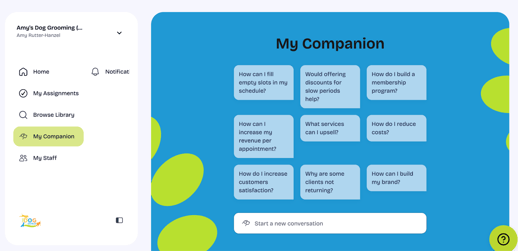 How do I start using My Companion? Click the “My Companion” option in your left-hand menu. You can choose from suggested questions or type your own in the “Start a new conversation” field.